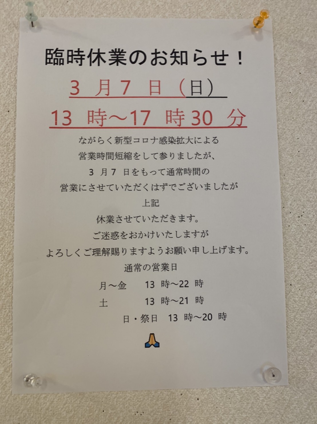 通常平日は22時まで営業していましたが、宣言を受けて20時までといたします。