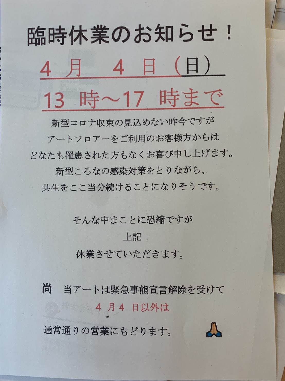日頃当アートをご利用いただいていますお客さまには、大変申し訳ありませんが