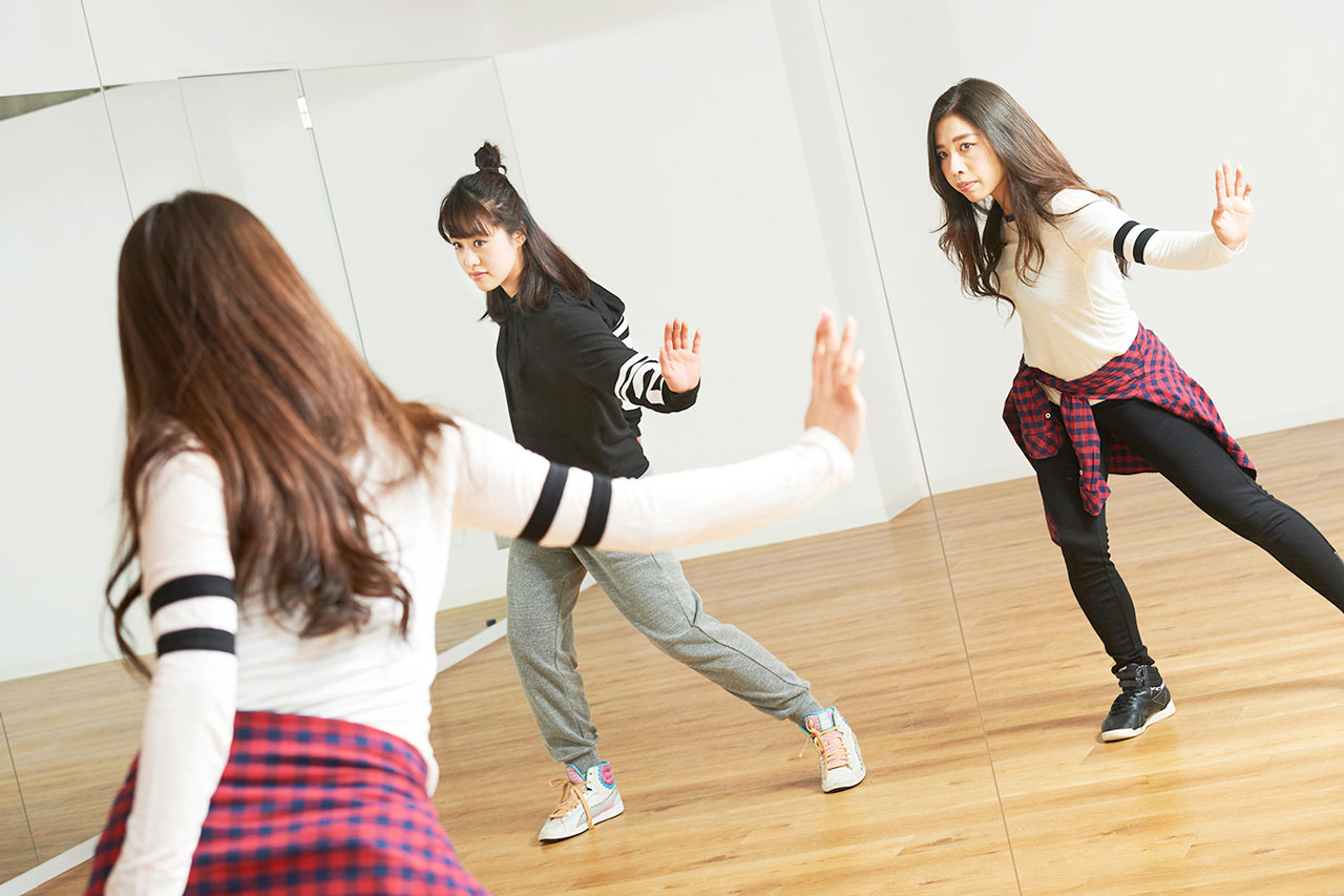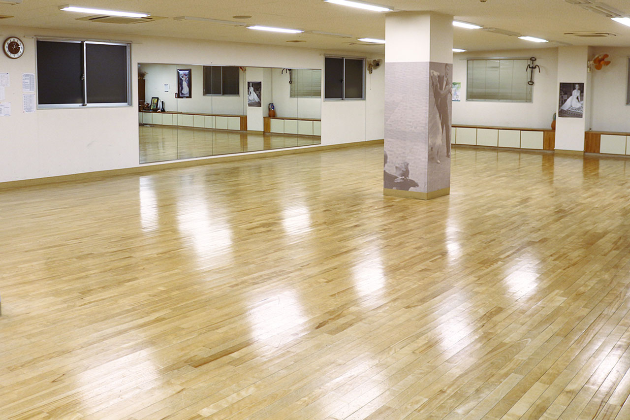 床は全面桜ムク材を使用しております。明るいフロアで、鏡も3面あります。